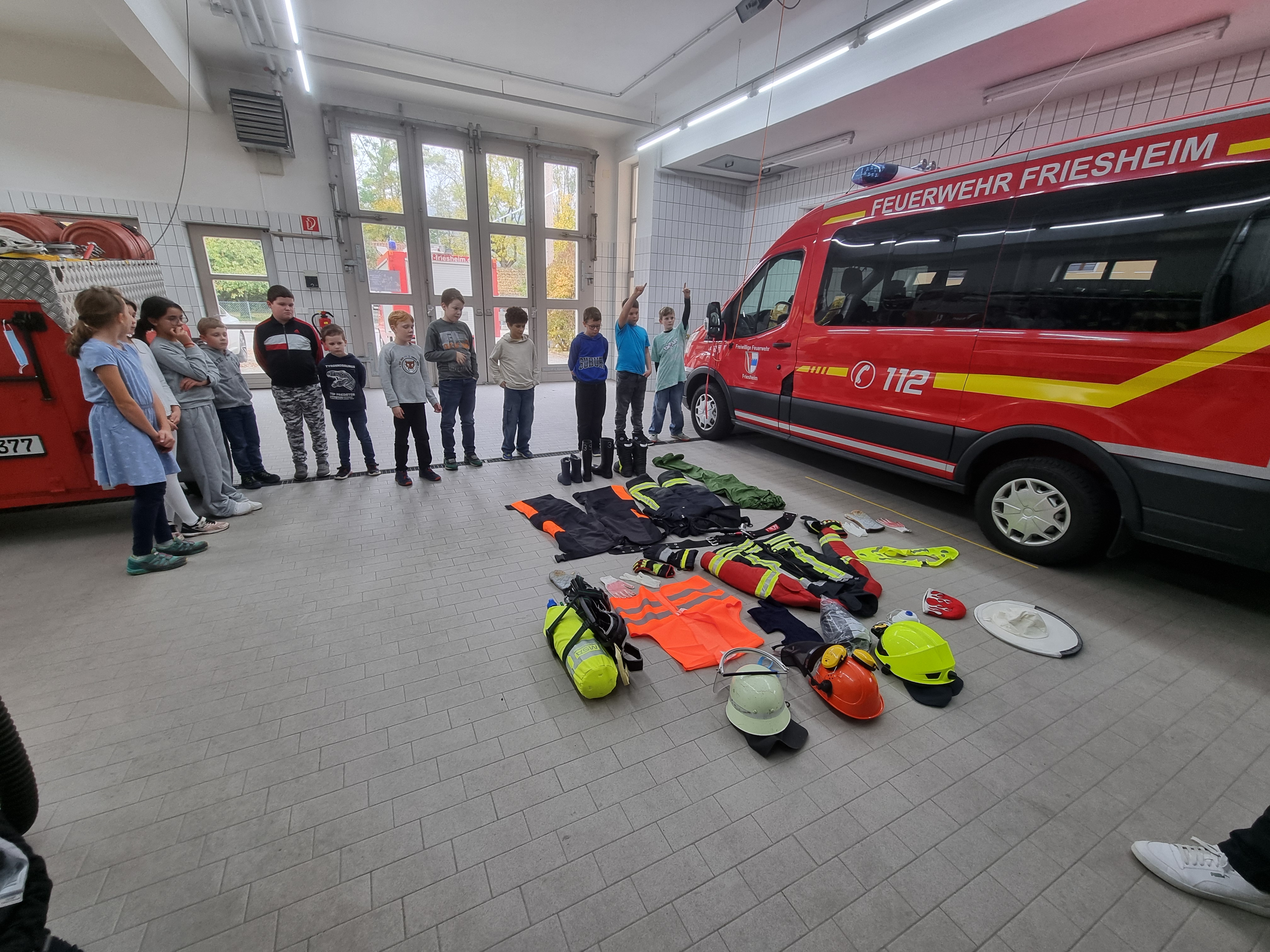In der Oktoberübung lernten die Kinder alles über die PSA bei der Feuerwehr kennen. Dabei wurden in der Gerätehalle alle Gegenstände, die bei der Feuerwehr Friesheim vorhanden sind, wie bei einer Explosionszeichnung aufgelegt. Es schmuggelten sich auch einige fremde Gegenstände mit dazu. Die angehenden Feuerwehrler durften dann herausfinden, was zur PSA gehört und wozu man es benötigt. Anschaulich wurden diese Gegenstände erklärt und von den Kindern untersucht. Die Kinder staunten sehr über den Umfang der PSA eines Feuerwehrmannes.