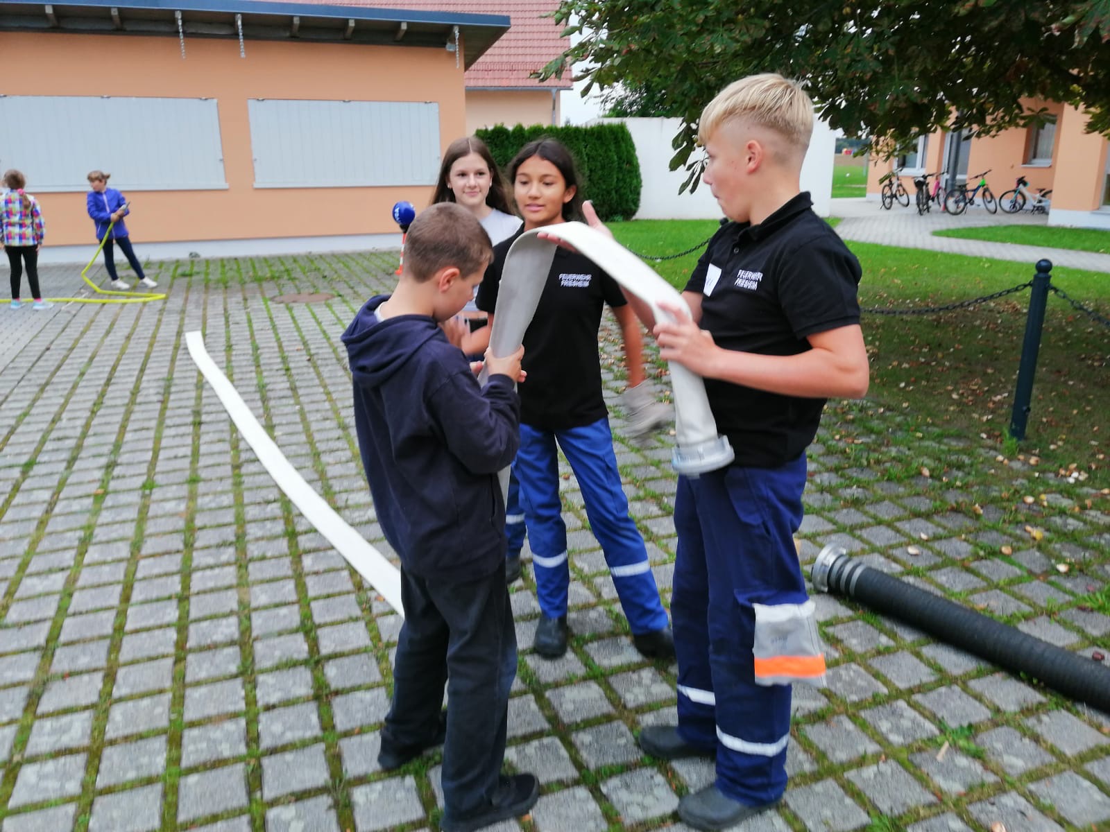 Auch die Kommandanten Sebastian Seidl und Daniel Bübl und Vereinsvorstand Matthias Beck beantworten Fragen der eifrigen Jugendlichen und halfen beim der Stationsausbildung.